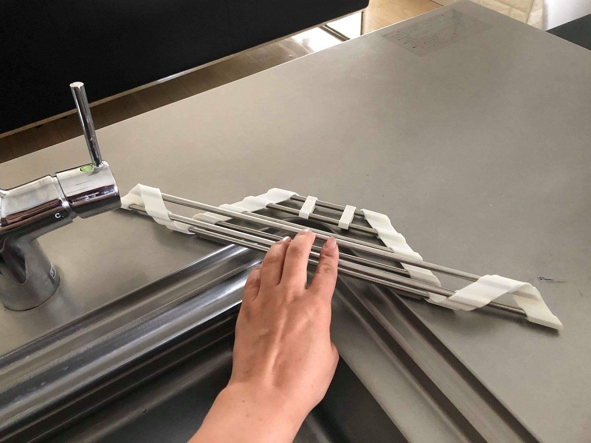 そしてこのアイテム、商品名にもあるとおり”たたむ”ことが可能!くるくるとと包むようにたためば、とってもコンパクトにすることができます。必要なときだけ広げて、それ以外はしまっておけるので、キッチンのシンク回りがとってもすっきりしますよ!