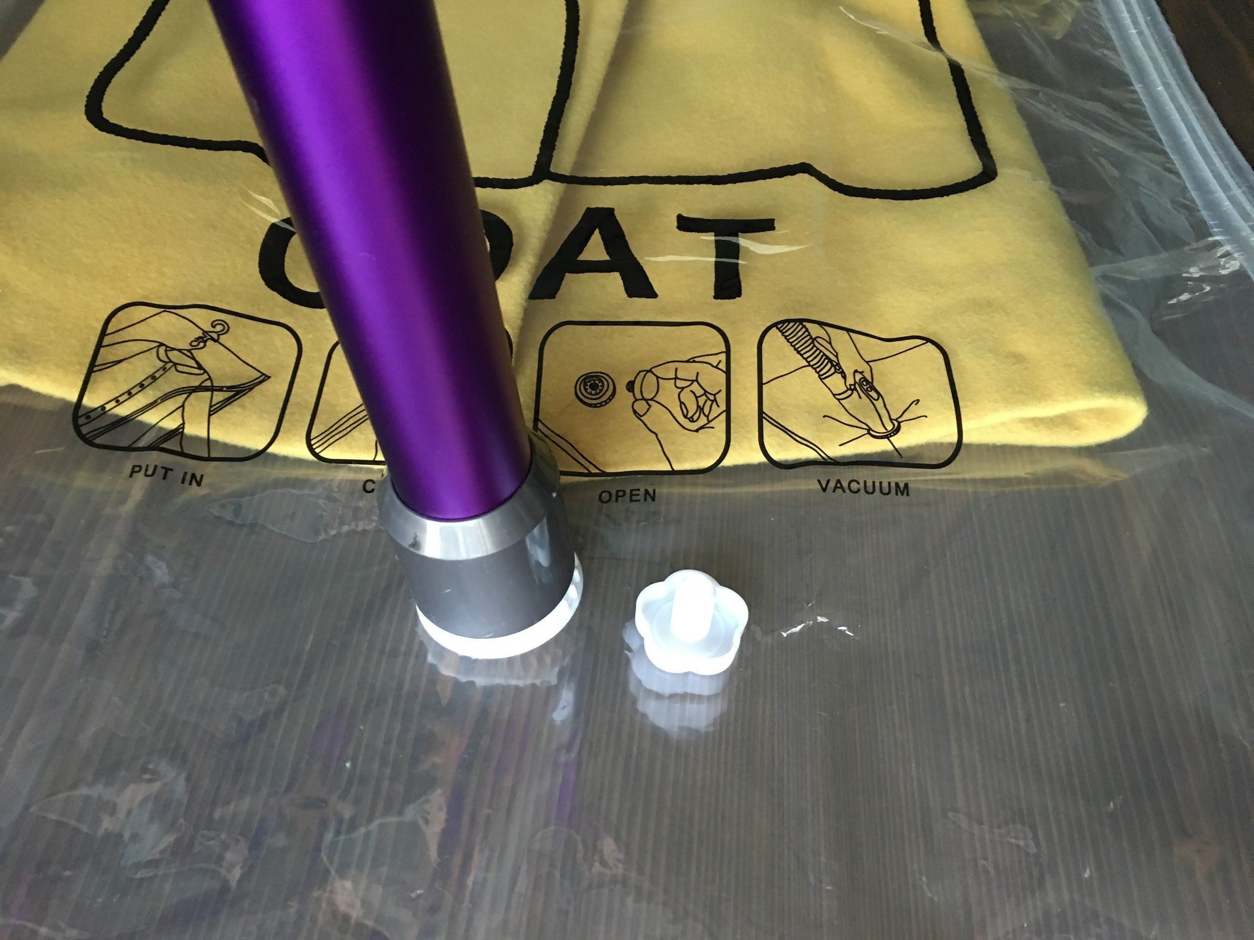 バルブのふたを開けて、掃除機で袋のなかの空気を吸い込みます。掃除機の強弱にもよりますが、今回は20秒ほどで完了しました。