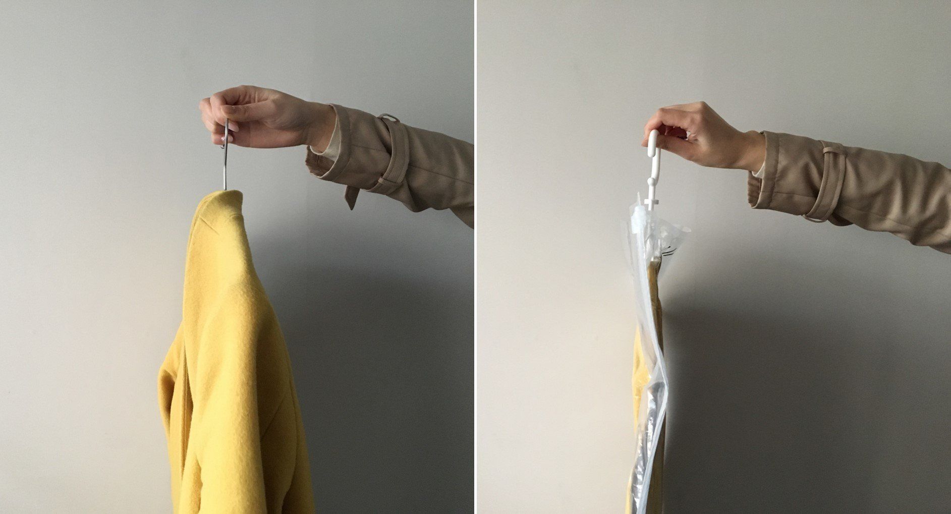 コートをハンガーにかけた状態で「ハンガー圧縮袋」のなかに入れます。このときに袖や裾をきちんと入れておいたほうが、圧縮したときに余計なシワができにくいです。