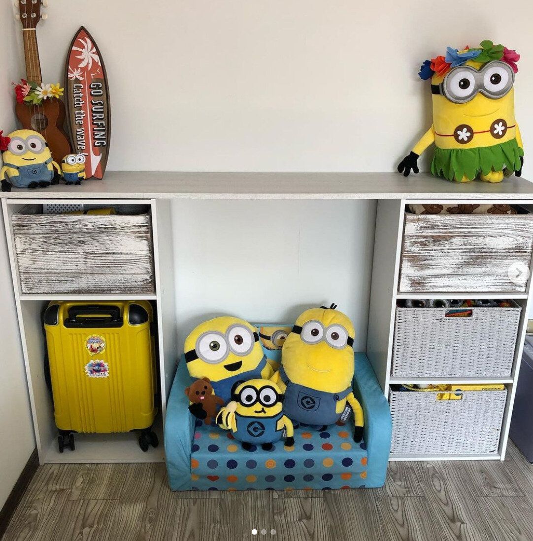 カラーボックスの上に板を乗せ、収納ケースやソファ、ぬいぐるみなどをひとつの収納としてレイアウトした素敵なアイデアです。ぬいぐるみやスーツケースのイエローと、収納ケースのホワイトが美しく調和!見せるところと見せないところを上手く使い分けることで、スッキリ整います。