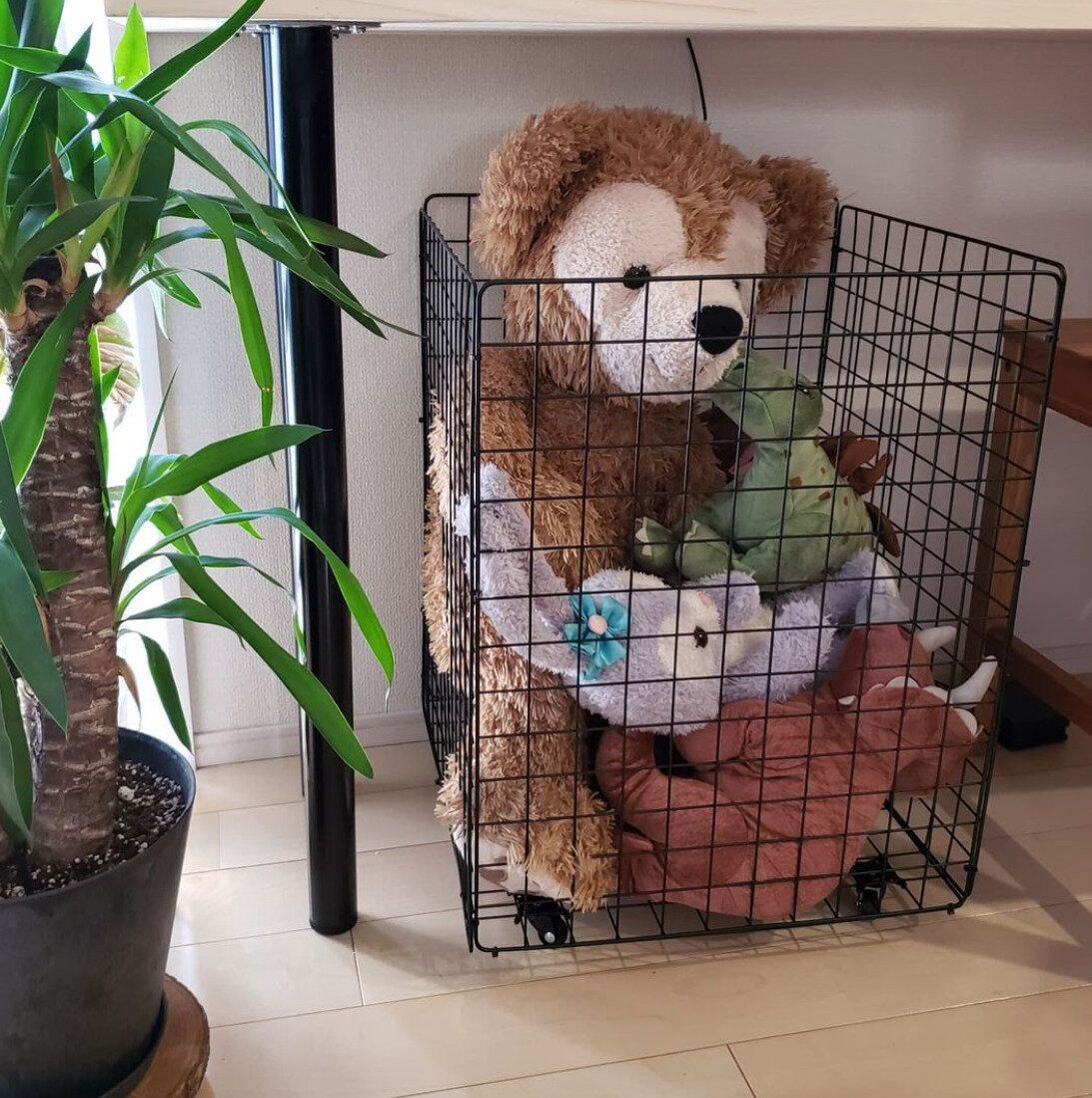 こちらの素敵なぬいぐるみ収納は、セリアのワイヤーラティスと結束バンドでつくるつくり方を見て、真似してつくってみたそうです。便利なキャスターつきで、お掃除や移動も手軽になりそうですね。ぬいぐるみをポンと入れてもスッキリ見えて、インテリアになじみ、おしゃれに収納できるぬいぐるみ収納です。