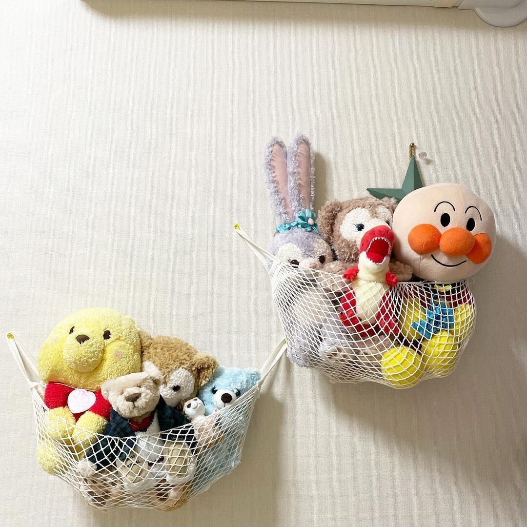100円ショップで売っているメッシュバッグを壁に取りつけるだけで、だれでも簡単にぬいぐるみのハンモック収納がつくれます。メッシュ部分を輪ゴムでサイズ調整すれば、収納したいぬいぐるみの大きさに合わせたハンモックになります。