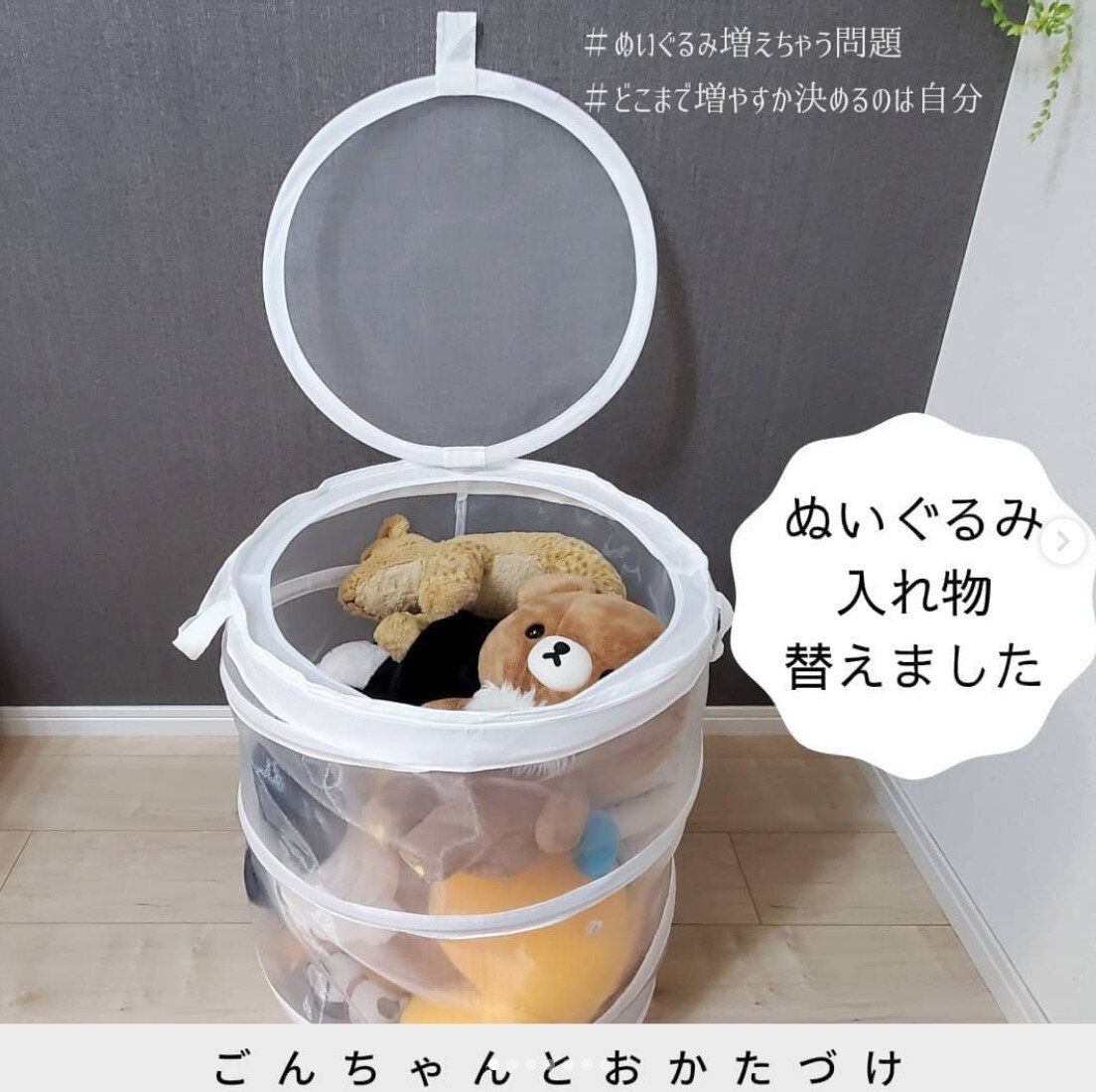 こちらはダイソーの550円商品のかごを活用した素敵なアイデア。ぬいぐるみたちがひょっこりと顔を出していてとてもかわいいです。出し入れもしやすく、片づけもはかどりそうです。