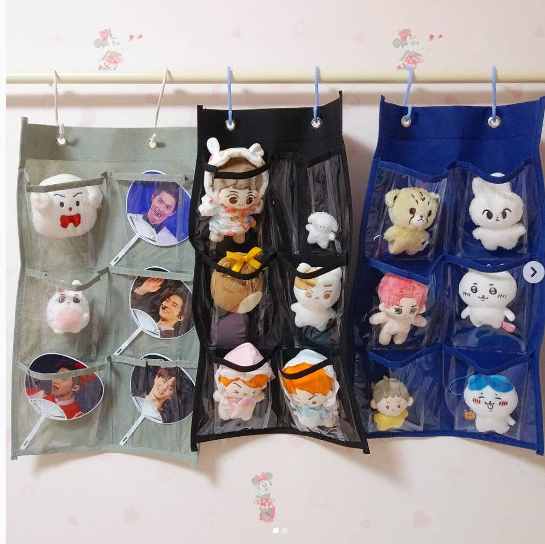 こちらは、セリアのウォールポケットを使った素敵な収納アイデアです。ポストカードなどを入れるのにちょうどいいサイズ感で、小さめのぬいぐるみやうちわもすっぽり。クリアポケットなのでお顔が見えてかわいいです。