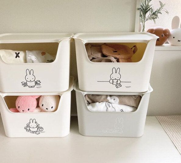 ミッフィーのイラストが描かれた収納ボックスにミッフィーのグッズを収納している例です。ミッフィーのぬいぐるみが顔をのぞかせていてかわいいですね!