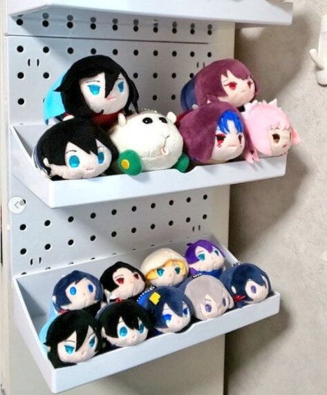 こちらは100均のパンチングボードに棚を取りつけ、ぬいぐるみを収納している例です。何段にも収納できるので、たくさん置けそうですね!