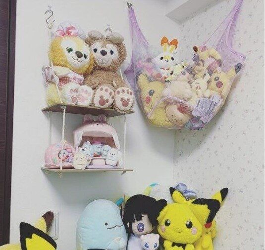 こちらはハンモックとブランコにぬいぐるみを収納している例です。ほとんど100均の材料でつくることができたのだとか。たくさんのぬいぐるみもきれいに収納できていますね。