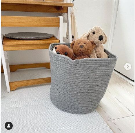 どんどん増えがちなぬいぐるみは大きめのバスケットにまとめて入れて収納するのもおすすめです。コットンロープなどのやわらか素材のバスケットを選べば手触りもよく、小さなお子さんでも簡単にお片づけができ、出しっぱなしにしても安心です。