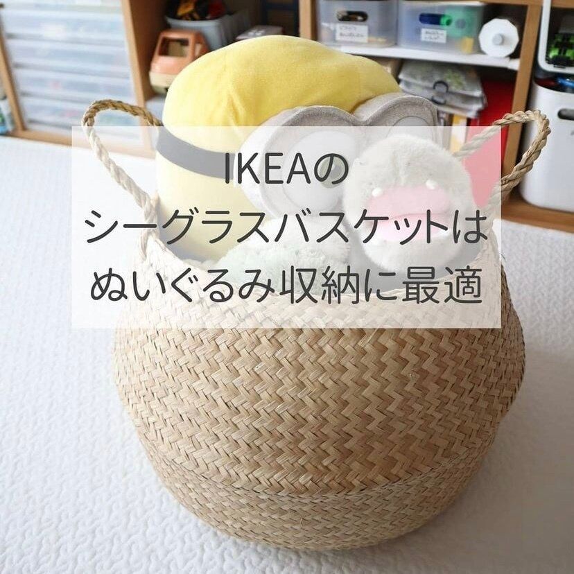 IKEAのカゴにぬいぐるみ達をギュッと収納。その姿もかわいいですよね!片づけも簡単で、インテリアとして置いてあっても気になりません◎。子どもに「ここに入るだけにしようね」と教えれば買いすぎ防止に。