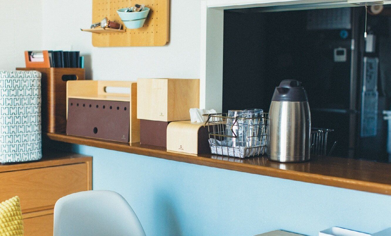 麦茶を入れたポットと割れにくくて軽いコップをキッチンカウンターにスタンバイ。これなら子どもたちは好きなときにセルフで麦茶が飲める。「ママ~、のど渇いた~!」と言われなくなり、親子ともどもラクに。