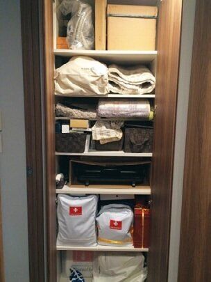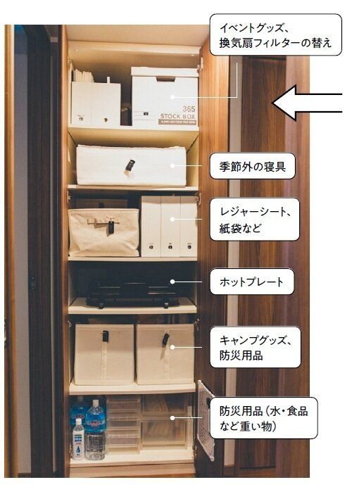 収納力があるから物を突っ込みまくり、カオス空間になっていた廊下の収納庫。使用頻度の低い物は上段、高い物は中段、下段は緊急時の防災用品と段ごとに物の定位置を決めたら一目瞭然の収納に。
