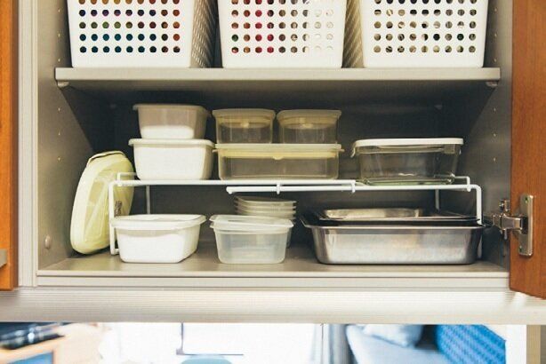 「収納グッズを使えば収納しやすいと思っていたけれど、取りやすさのポイントは見てすぐわかる物の配置と余裕のある空間づかいでした」。今は伸縮するコの字ラックを1つだけ使用。