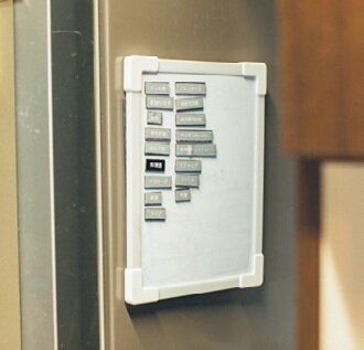 調味料や洗剤などのストック品はマグネットでラベルを作り、冷蔵庫に貼っています。欠品したら裏返して黒い面に。ボードをスマホで撮影しておけば、買い物の際も買い忘れなし!