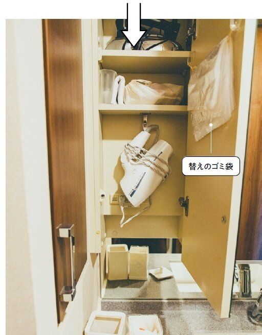 洗面台の上にあるゴミ箱用のゴミ袋は鏡裏収納の壁面につるし、一歩も動かず袋を交換できる仕組み。「100均の麻ひもとフックで、鏡裏にビニール袋をつるす場所をつくりました」。