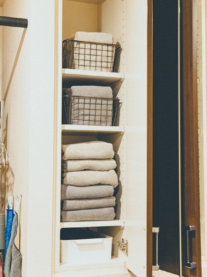 上段のタオルを下段と同様に積み重ねると、取りにくいうえ、雪崩のようにまとめて降ってくることも。カゴに入れれば取り出しやすく、奥の空間も有効活用できる。