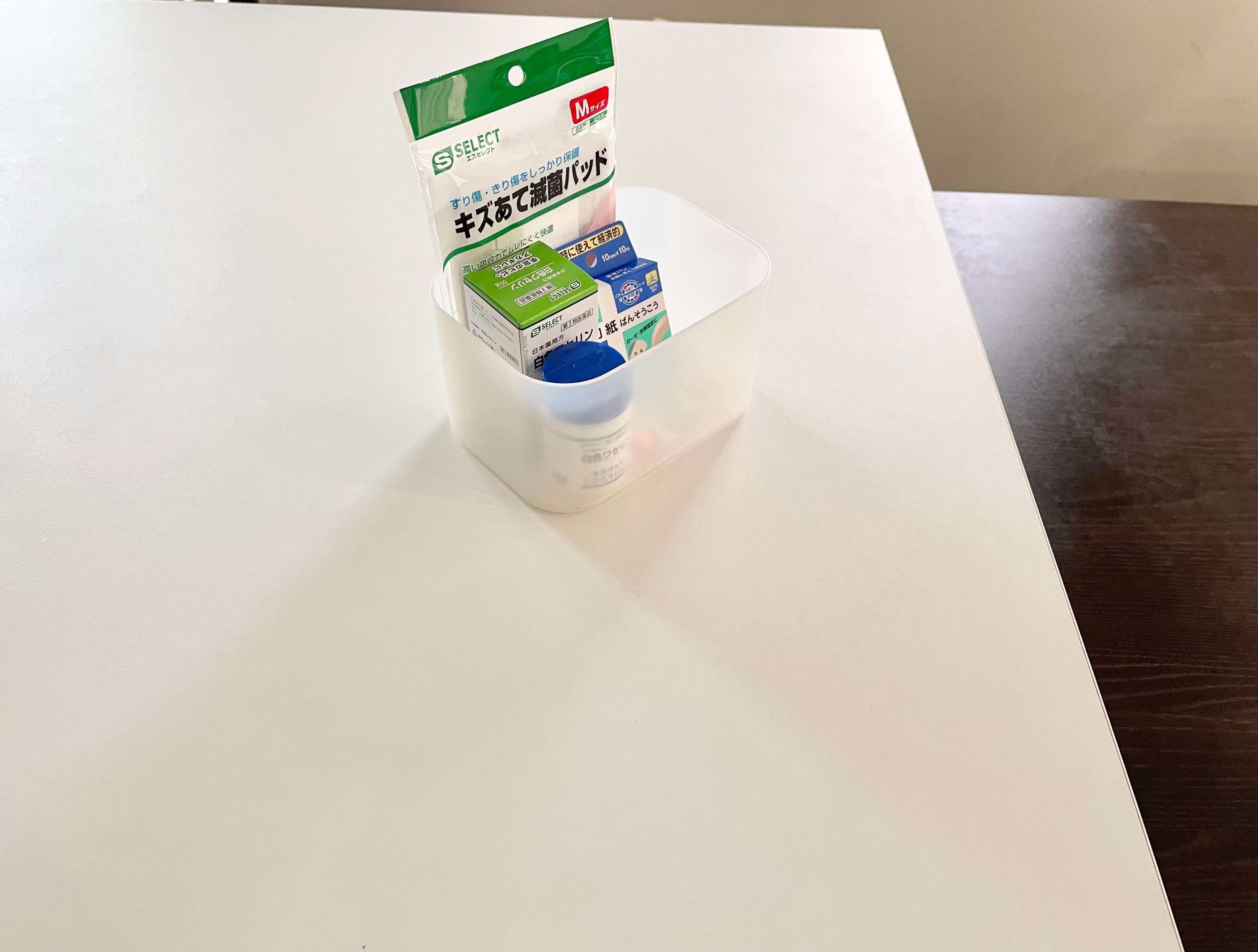 ”だしっぱなし”といっても、薬の袋をバラバラと置くのはスッキリしません。一時置きボックスに入れてまとめます。