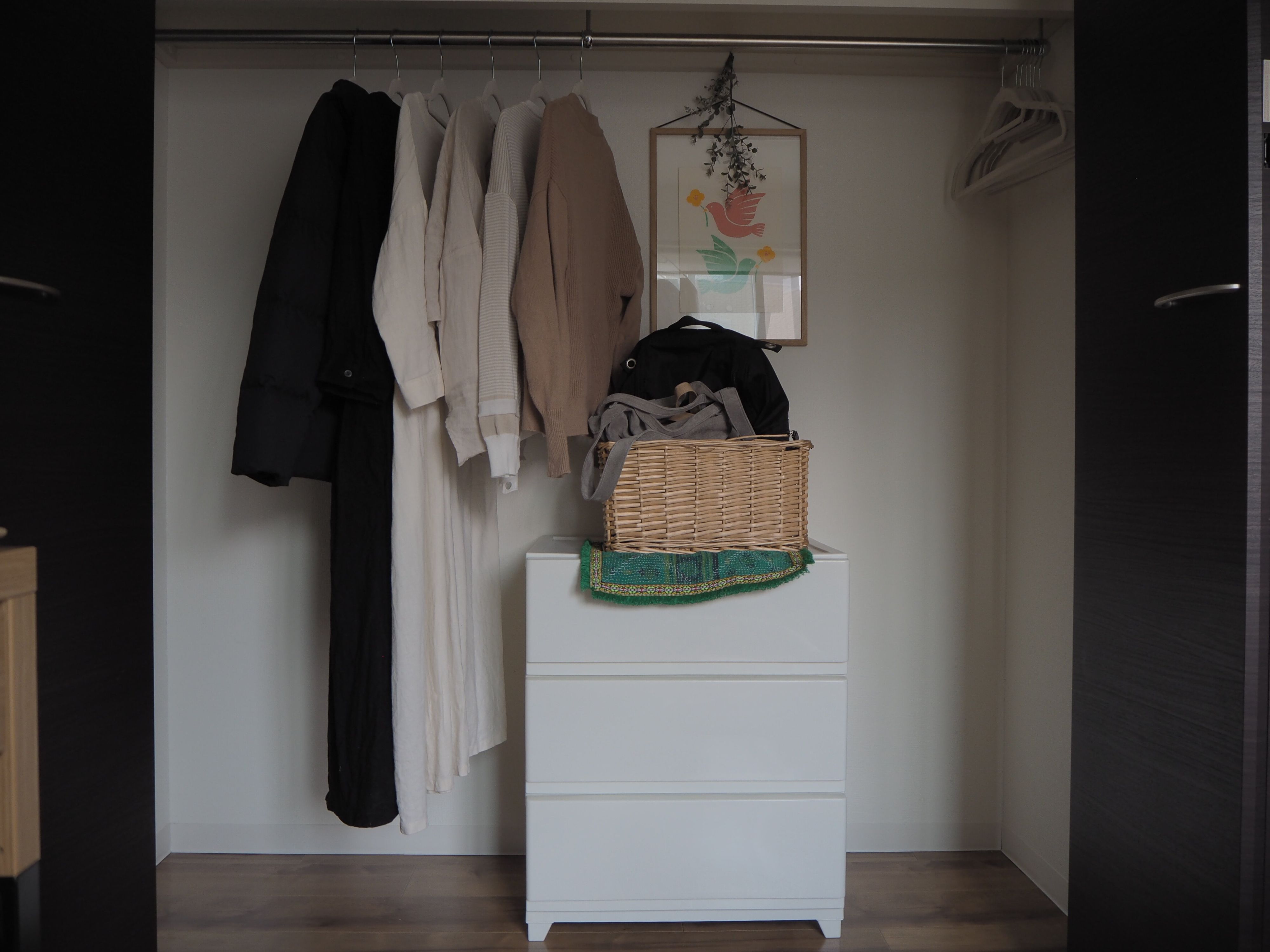 クローゼットの中を一掃し、計画書通りの種類・枚数を美しく並べてみてください。そして、それ以外の服は一旦空き箱や袋などにまとめて、見えないところにしまっておきましょう。