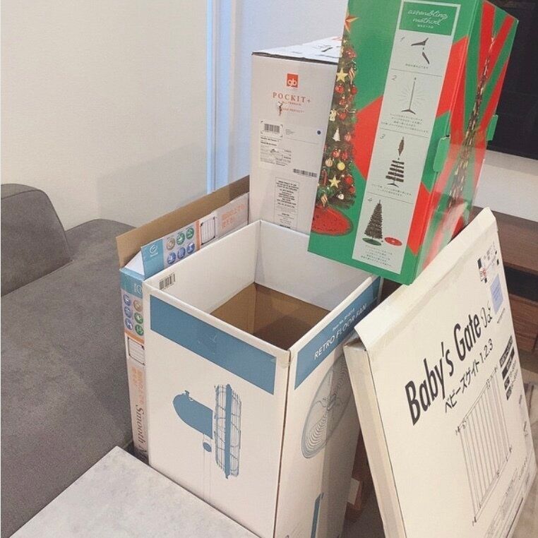 クリスマスツリーの箱、扇風機の箱、おもちゃの箱……。