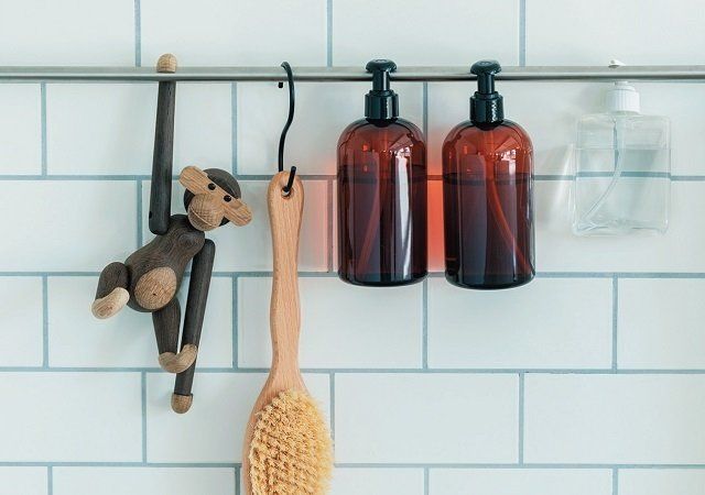 ぬめりが気になる、浴室のシャンプーボトルや掃除グッズは、直接床に置かないのが鉄則。ポールの上に置いたり、フックに掛けたりすることで、汚れをブロックして。床の上の物をどけて掃除する手間も省けます。