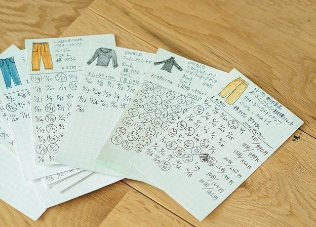 カードに服の値段や着た回数などを記録。「飽きずに30回着られるか」「1回のコストは50円以下か」を目安にし、それをクリアしたら迷いなく捨てられます。買った値段を着た回数で割れば1回当たりの単価が判明。コスパを考え、自然と高い服は買わなくなりました。