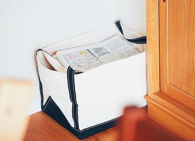 新聞紙やダイレクトメールは、収納スペースに収まっていればイライラしないもの。それだけに、ついためてしまいがちです。「あえて小さい箱やかごに入れ、小まめに捨てられるようにしています」。