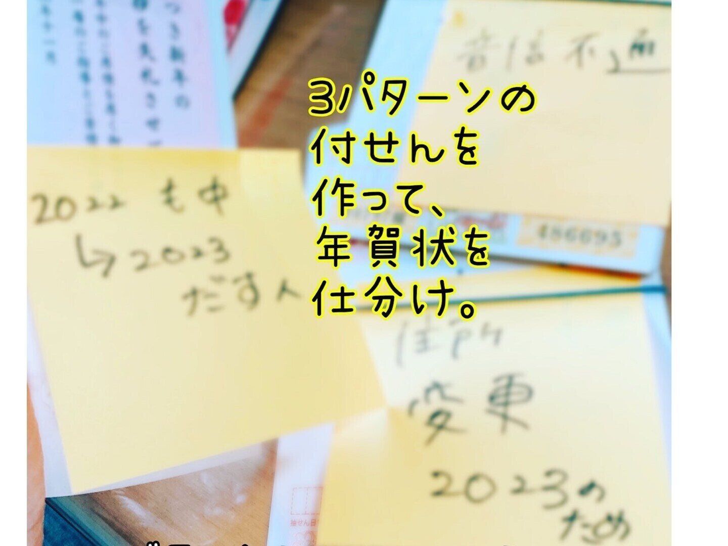 3パターンに分けるために付箋を作成し、該当する年賀状を仕分けします。仕分けした年賀状を輪ゴムでひとまとめにして付箋を貼り付けます。