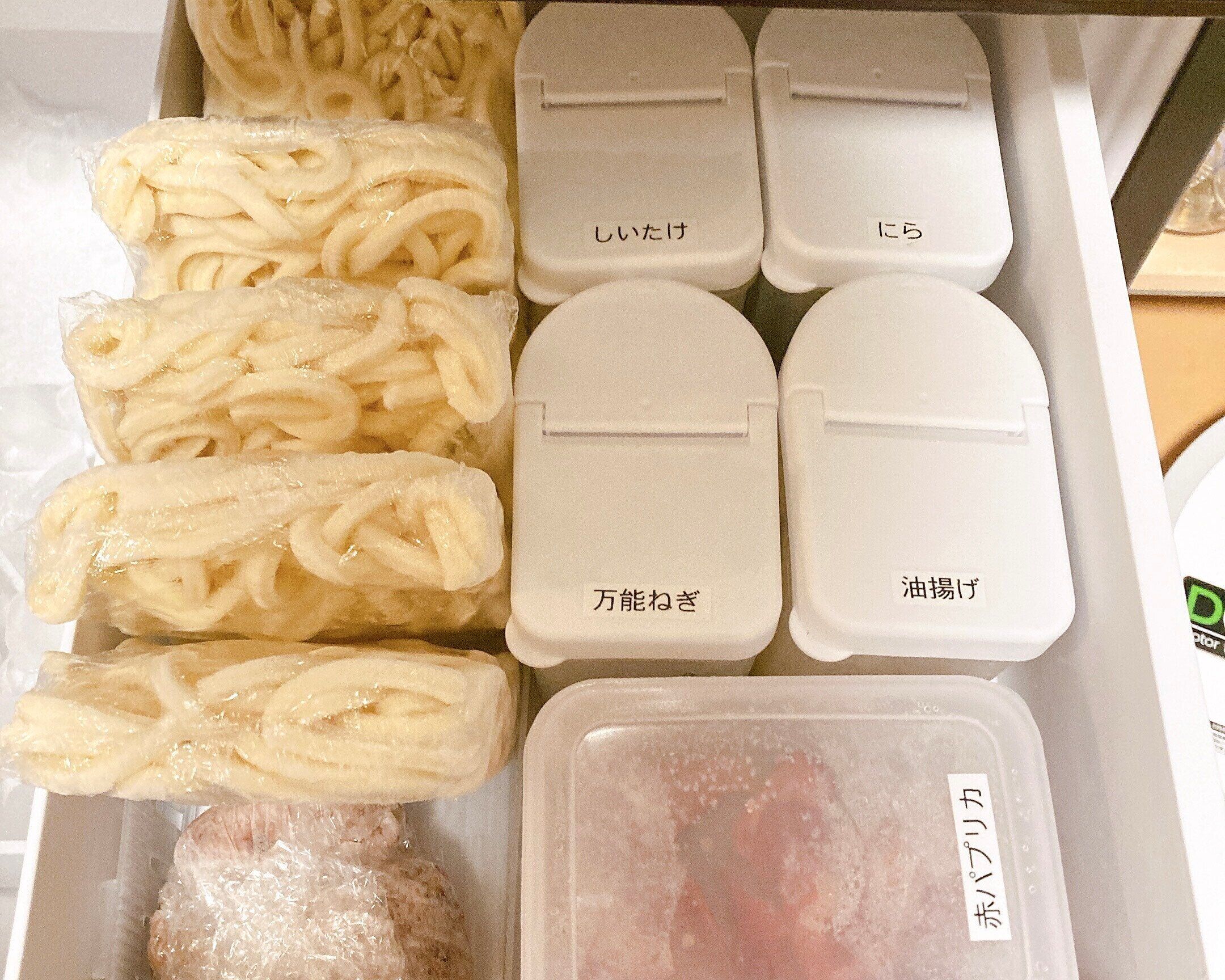 冷凍室:Seria『フリーザートレーロング(仕切り×1)』『シャカシャカねぎポット』、DAISO『新鮮野菜スタンド』『シール容器330ml×3P』
