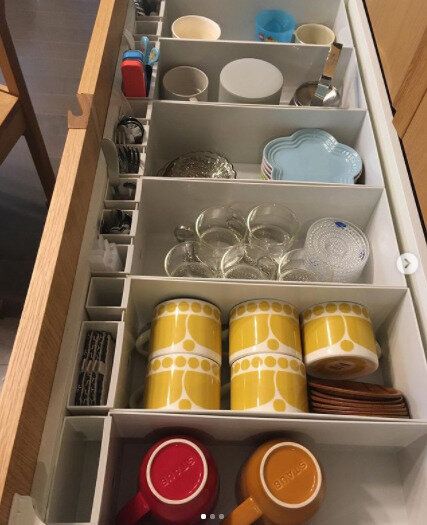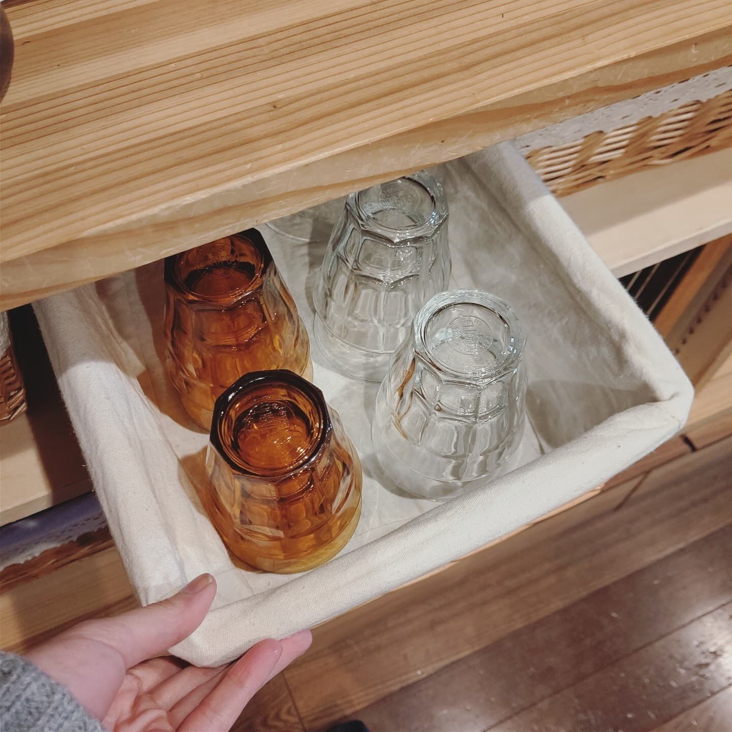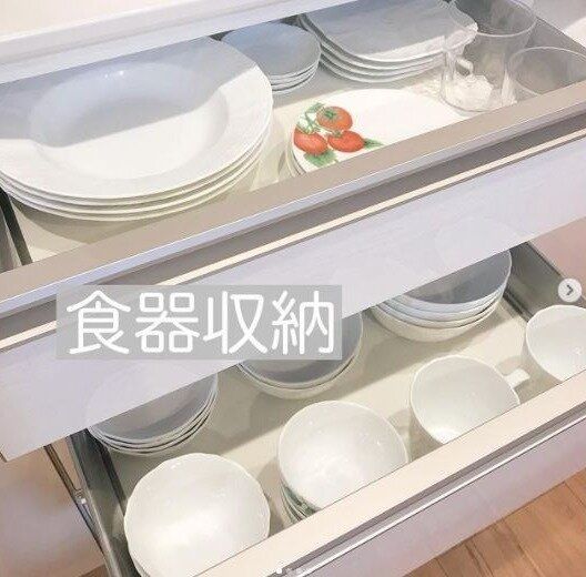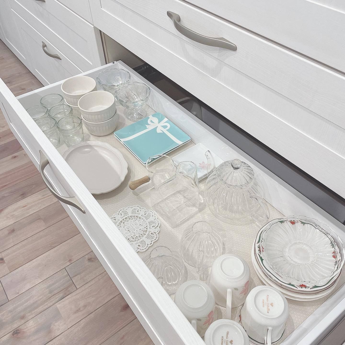 こちらも引き出しに食器を収納したアイデア。少し余裕を持たせて置いてあると美しい!引き出しを開けたときにワクワクしそうです。食器の下にニトリの「抗菌すべり止めシート」を敷くことで食器がずれることを防いでいます。