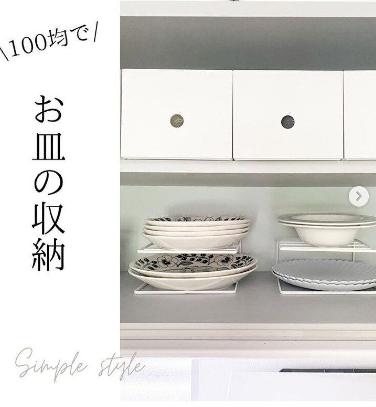 セリアの「キッチンワイヤーディッシュラック」を活用した、スッキリとした食器収納アイデア。上下に分けてお皿を収納できるので、見た目も美しく、取り出しが簡単になりそうです!ホワイト・ブラックの2色のラックを、食器棚の雰囲気に合わせて使い分けるのもよいですね。