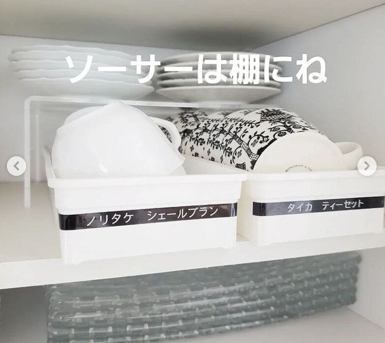 「イノマタ化学株式会社」の「キッチントレーワイド」と、無印良品のアクリル棚を組み合わせた、ティーカップ収納のアイデア。セットで収納できるので、わかりやすく使い勝手もよさそうです。さらにラベルを貼ることで、誰でも取り出しやすい収納に!種類別に分けておくと見た目も美しいです。