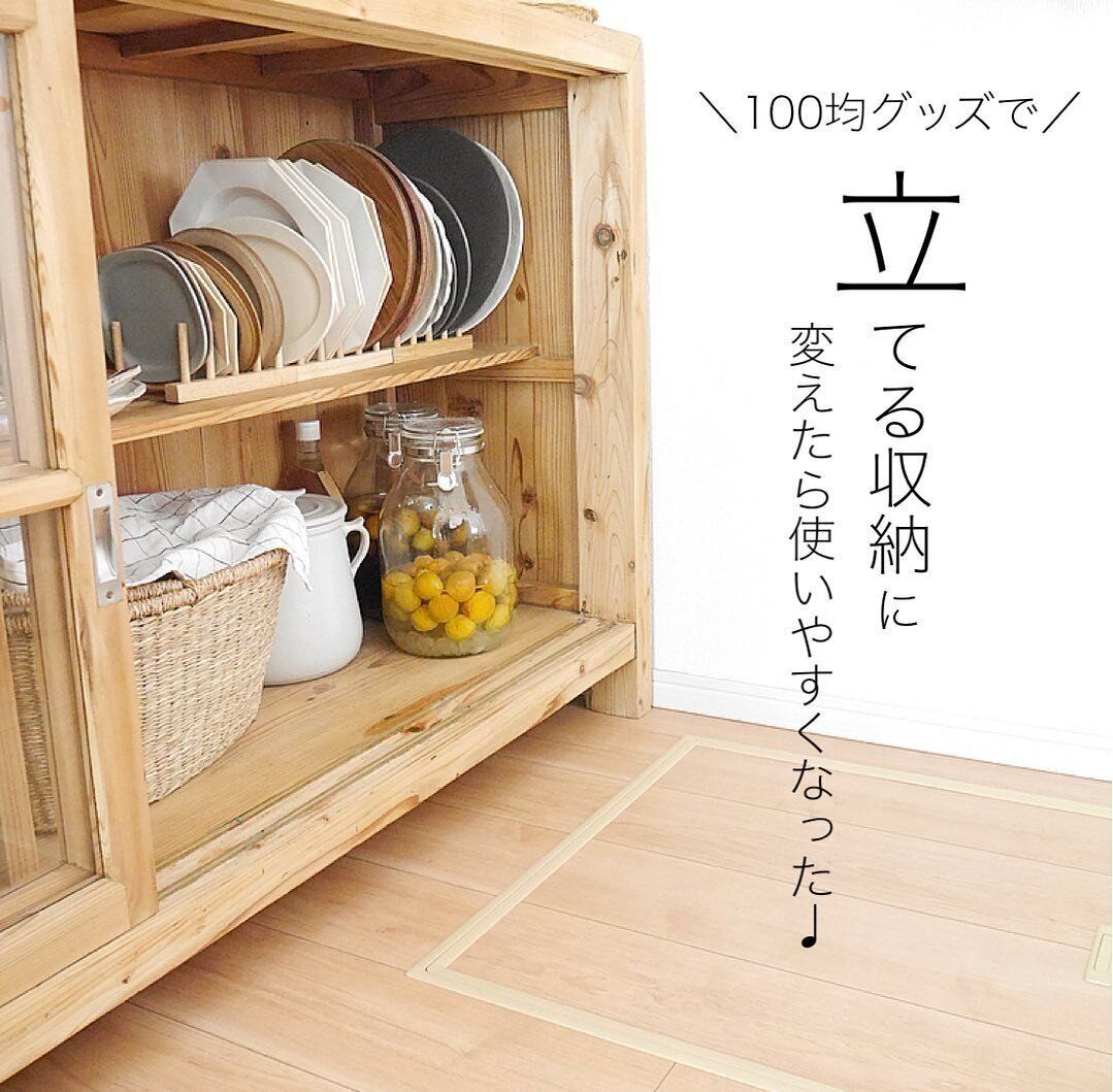 ダイソーの木製ディッシュスタンドを活用した、素敵な食器収納アイデア。ディッシュスタンドを使えば、お皿を重ねる収納から立てる収納に、手軽にチェンジできるのがうれしいところです。食器棚のナチュラルな雰囲気とも調和していておしゃれですね!