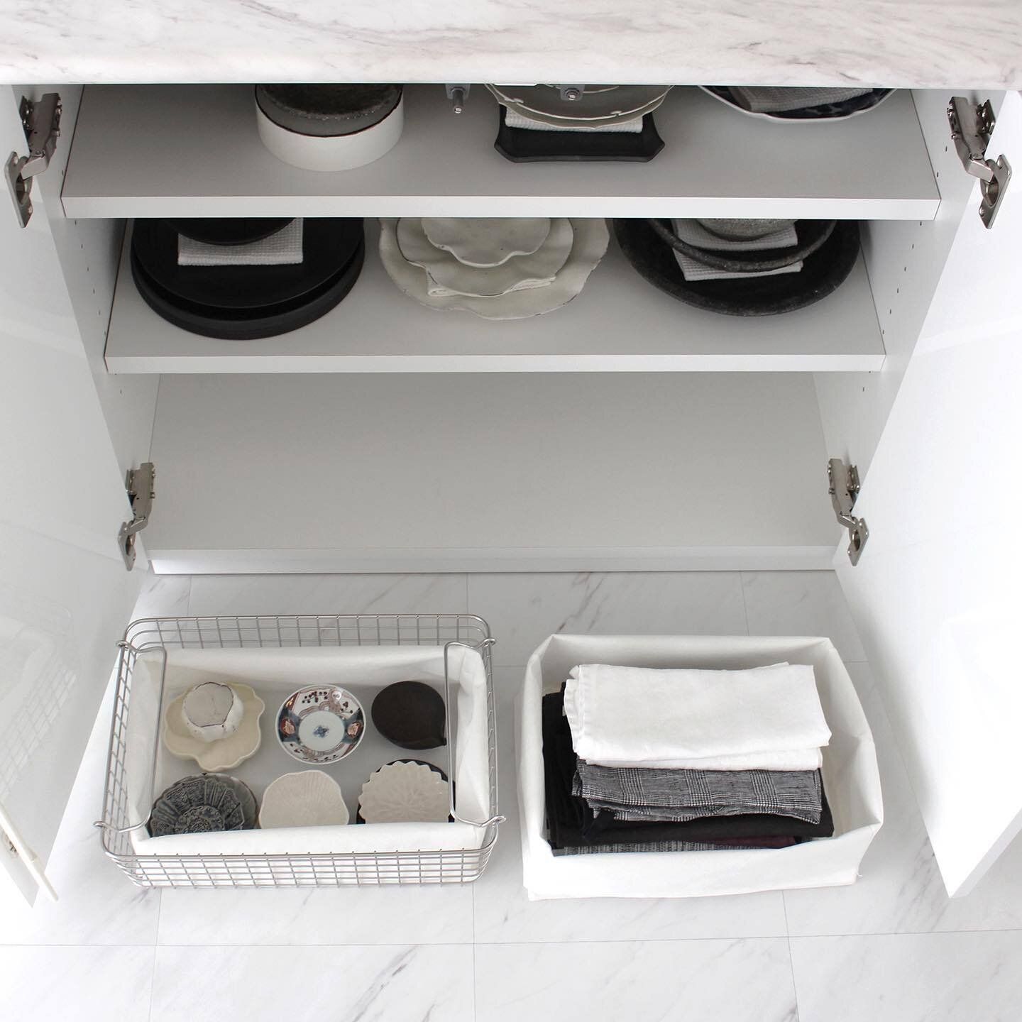 無印良品の「ステンレスワイヤーバスケット」と、「不織布仕切ケース」を活用した美しい収納アイデア。「不織布仕切ケース」は、収納用品内の仕切りや、インナーカバーにも重宝するアイテムです。カゴとケースを併用すれば見た目も美しく、器への衝撃も軽減してくれそうですね。