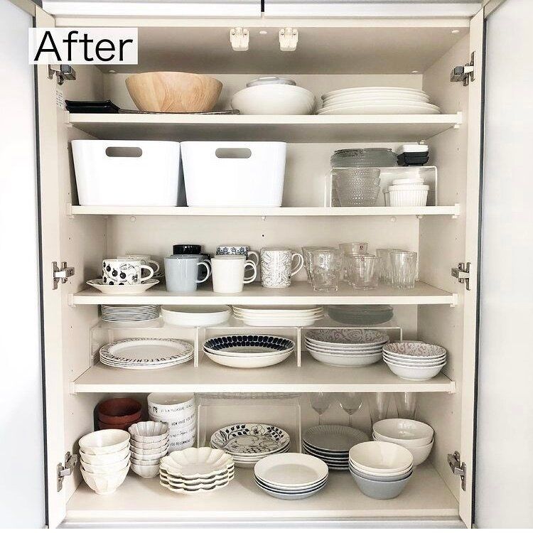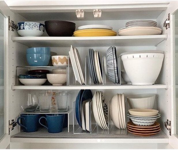 スペースを有効活用できる、無印良品のアクリル仕切り棚。食器を上下に分けて収納できるのがポイントです!収納スペースの大きさ、食器の量&サイズに合わせて、スタンドタイプとあわせて活用するのもよいですね。使用頻度別に食器を分けて入れれば、取り出しも簡単になりそうです。