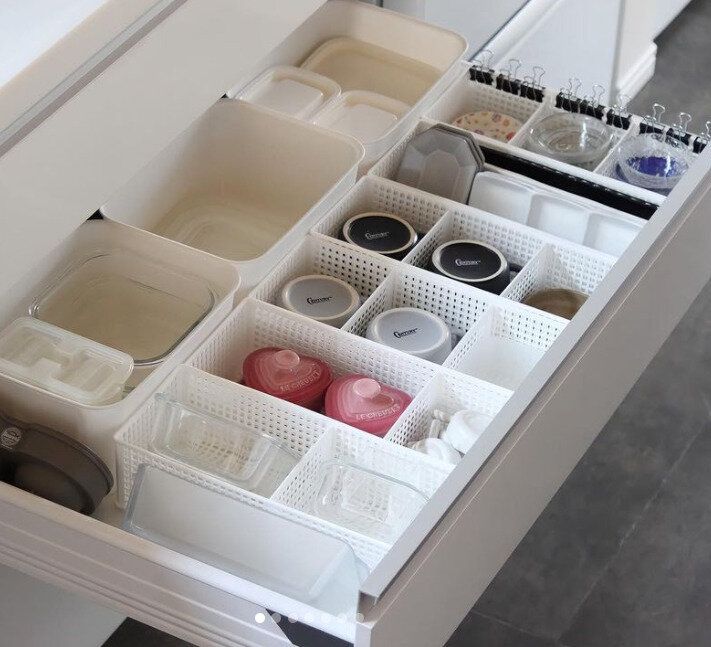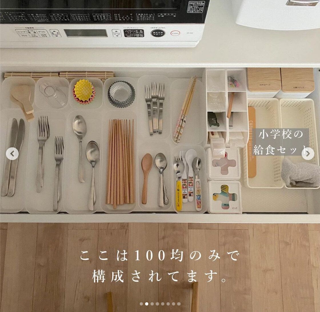 カトラリーや小物類も、100均アイテムを組み合わせることでこんなにすっきりとまとまります。収納するもののサイズに合わせてケースを並べ、引き出しの中で仕切れるタイプのアイテムを取り入れるのもポイントです。
