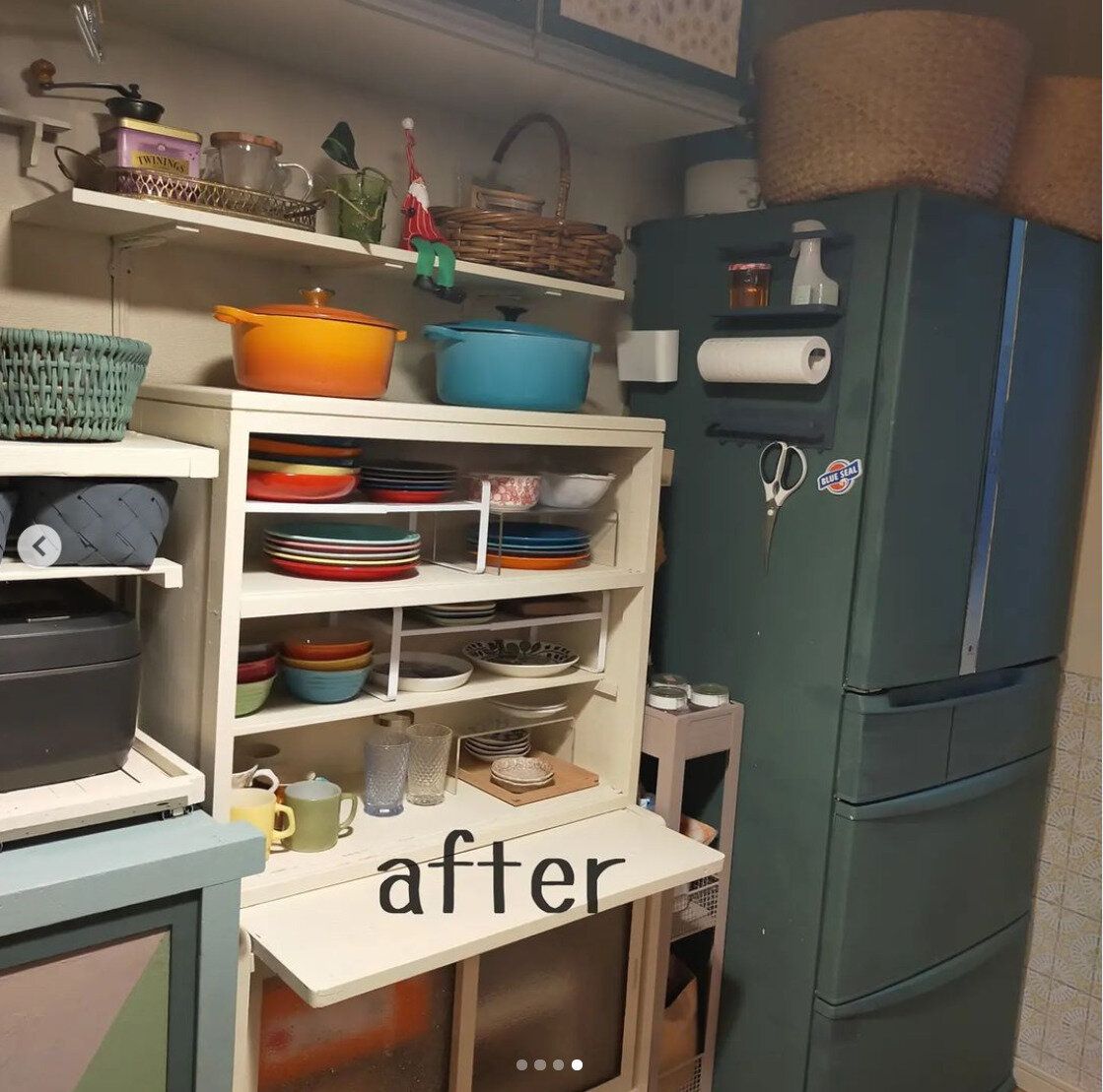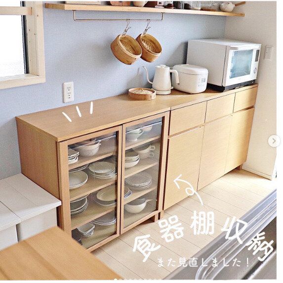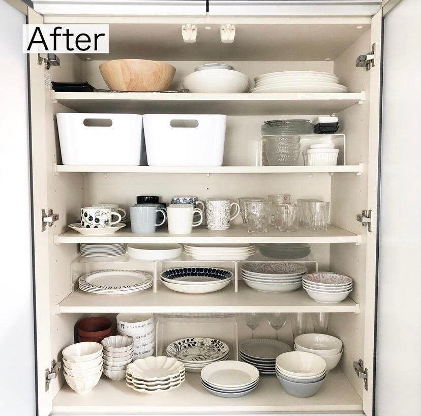 食器棚の中に、無印良品のアクリル仕切り棚を置いて、食器を収納するのもおすすめ。以前はかごを使用していたそうですが、片づけやすさから、こちらの収納のスタイルにしたのだとか。すっきりきれいに収納できると、取り出しやすくなりますね。