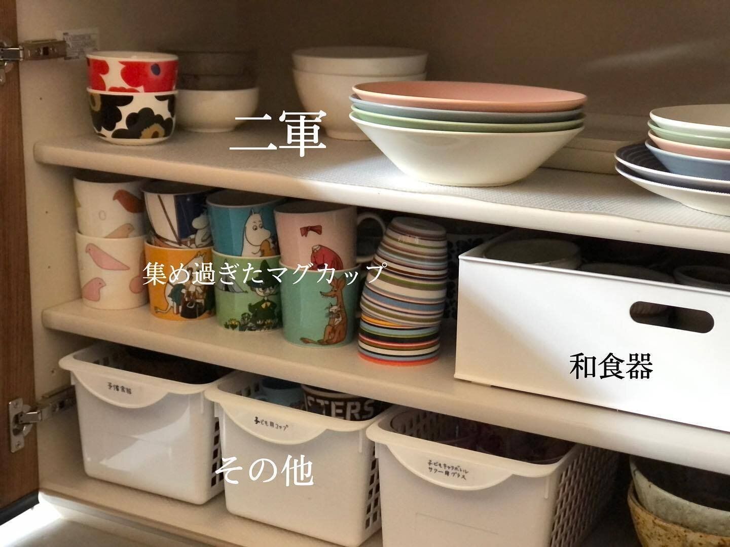 無印良品の収納ボックスを使い、種類ごとに食器を収納。どんどん増えてしまう食器も、定期的に見直すことで、すっきりした状態をキープすることができますね。