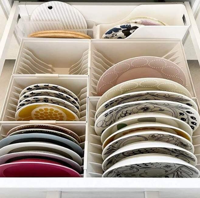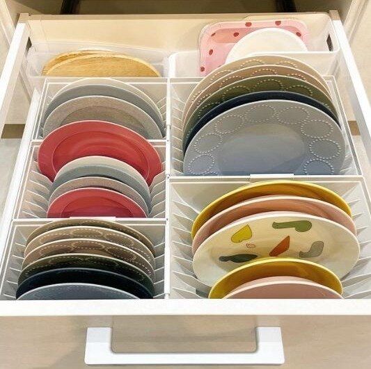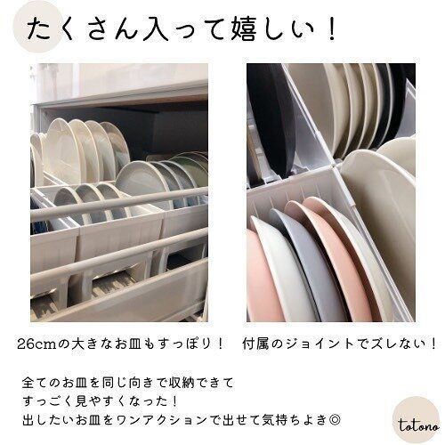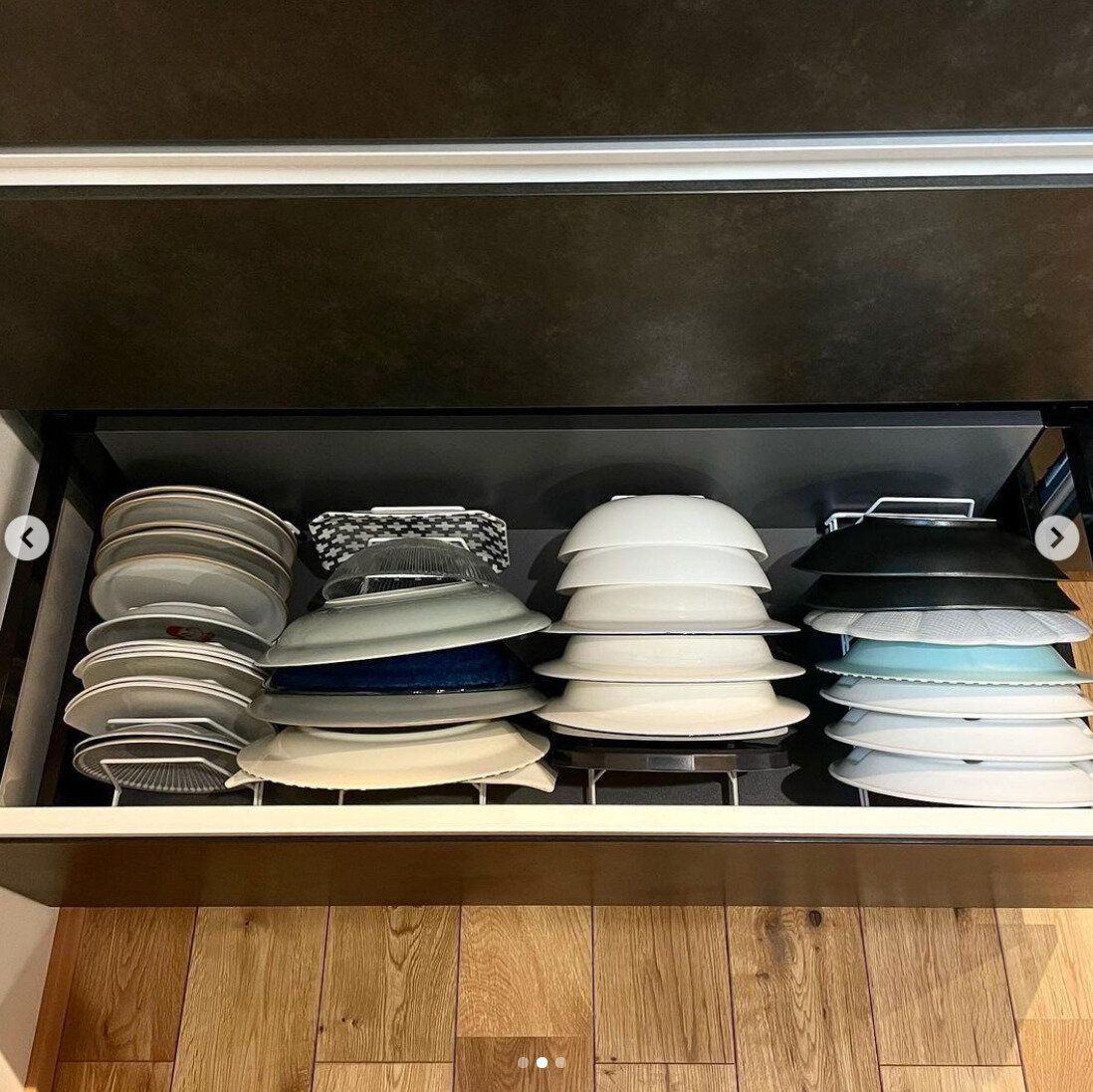 引き出しにお皿を収納するアイデア。リッチェルの「トトノ」シリーズのディッシュスタンドを使っています。それぞれのディッシュスタンドをつなげるジョイントパーツがついているので安定感も抜群。何より上から見やすく、取り出しやすい!片づけるのもラクラクですね。