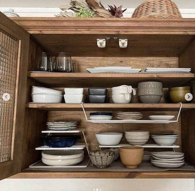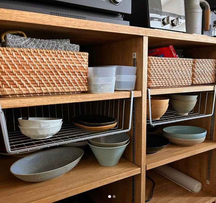 食器棚の収納は、少しでもスペースを有効活用して行いたいですよね。そこで、おすすめのアイテムが「えつこのスライドフリーラック」。スライドをすると、幅が約30~50cmに調整できるため収納したいスペースに合わせてピッタリと使うことができます。食器を2段にすることができ、空間を有効活用して収納力がUPしますよ。ぜひ参考にしてみてくださいね。