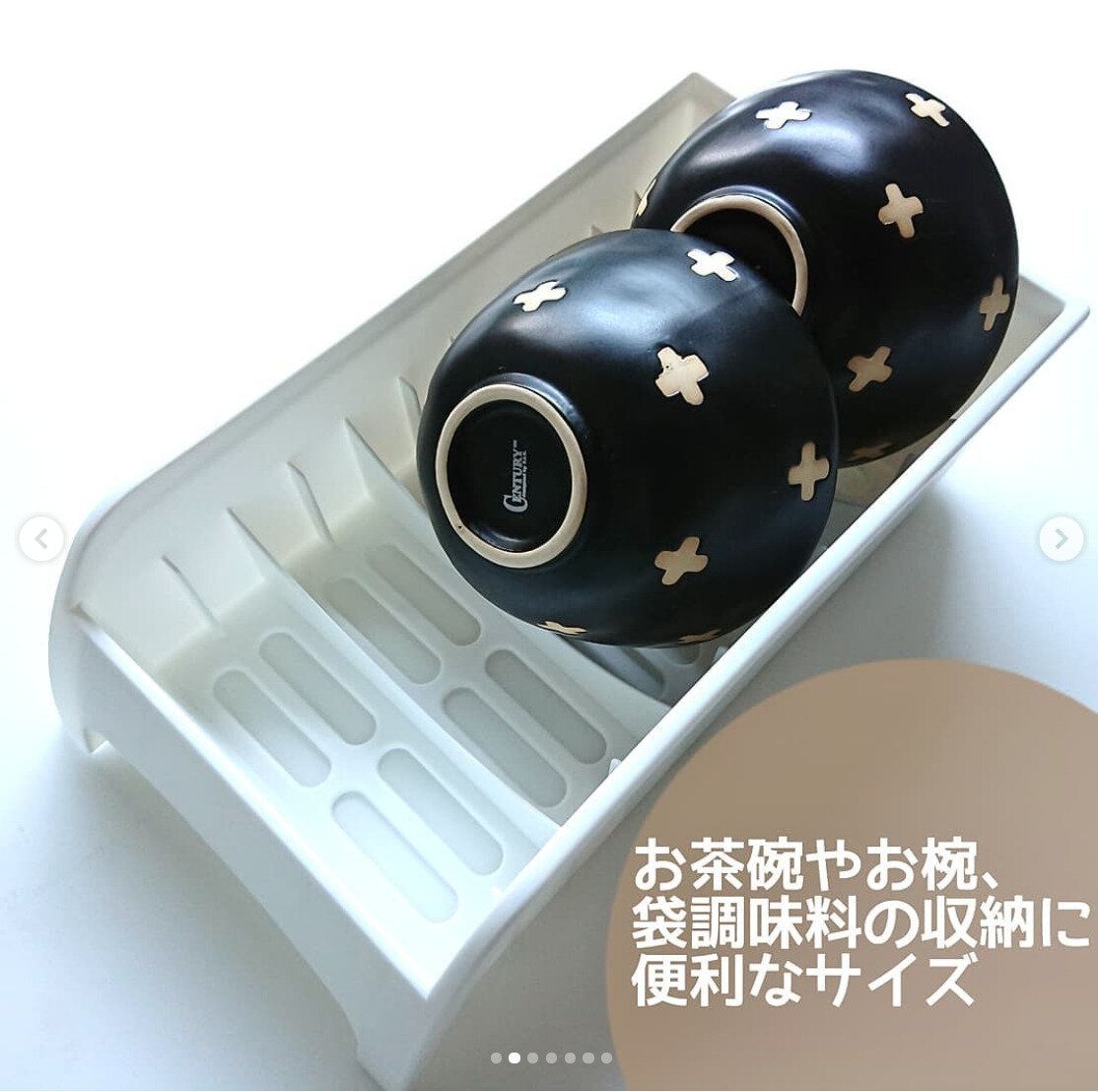 キャンドゥのお椀・小袋スタンドを使用すると、お茶碗やお椀、袋調味料もコンパクトにすっきり収納可能です!同じくキャンドゥで購入できる、スタンダード・スリムタイプのディッシュスタンドと併用するのも便利ですよ。