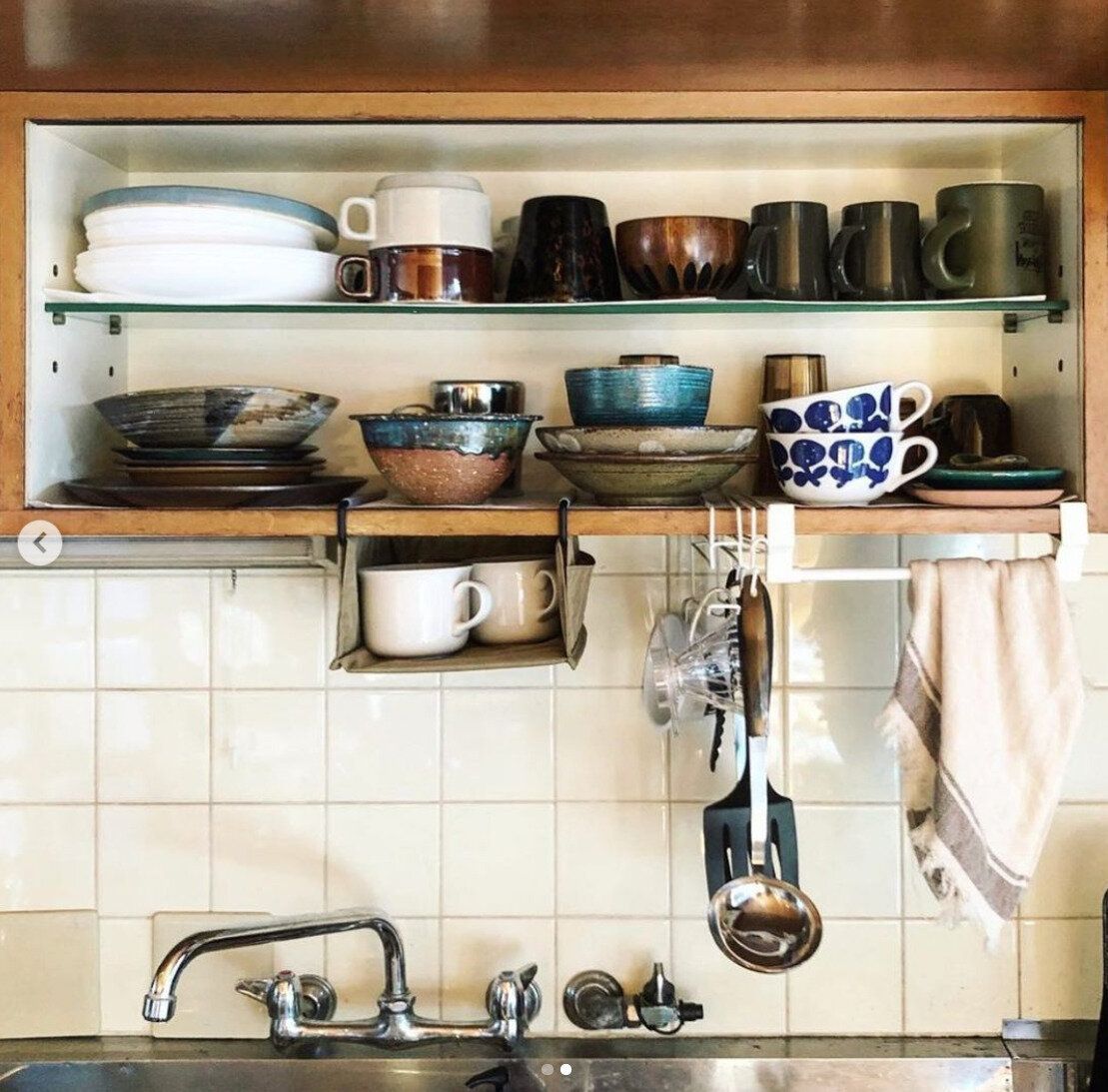 見える棚には、お気に入りのお皿やカップを置いて見せる収納に。ポイントは詰めすぎずに余白をつくること。この余白が一気に洗練された雰囲気にしてくれます。