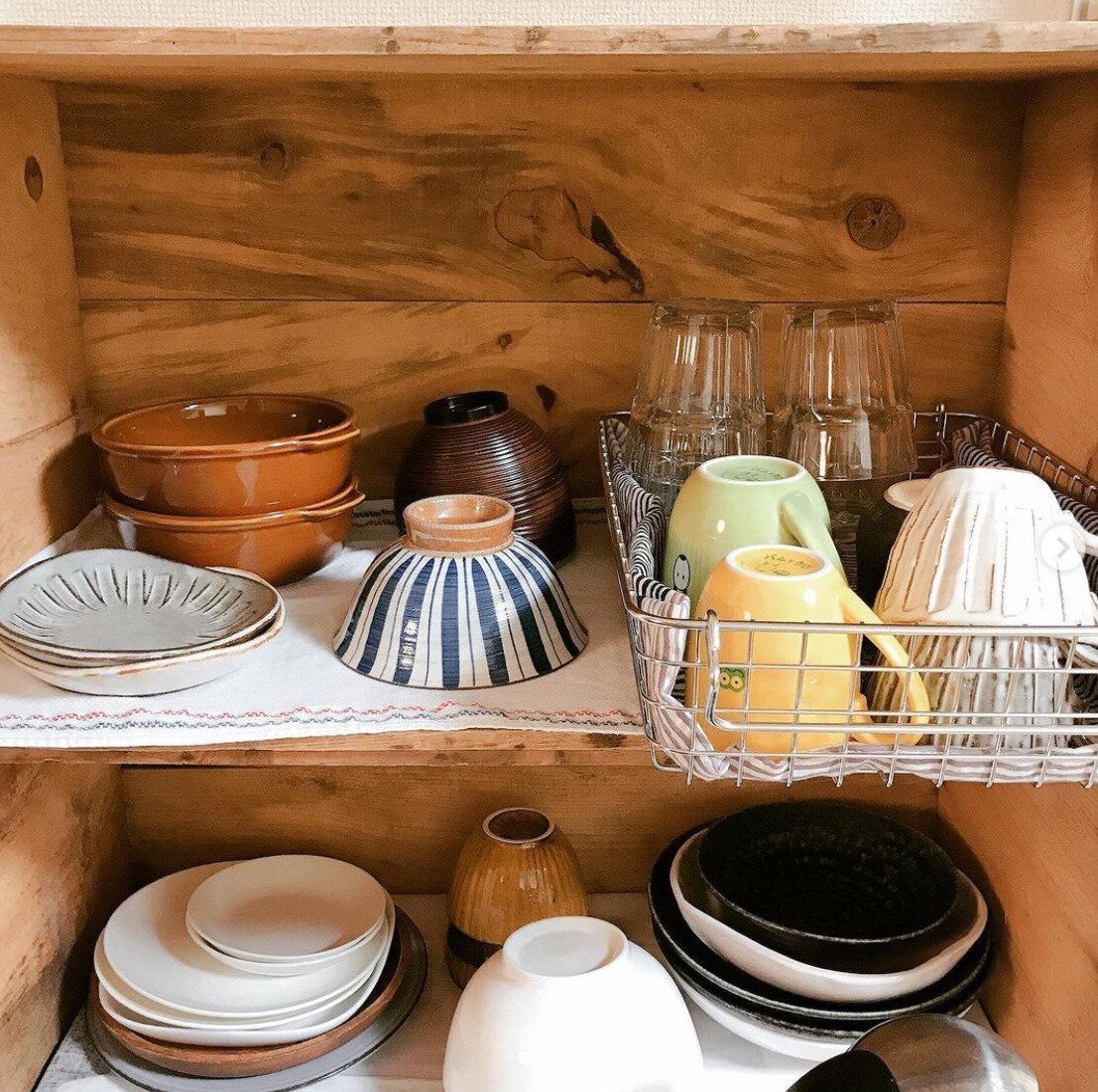 引き出しがない場所でも収納ボックスなどを使うと、すっきりと食器を収納することができます。1軍セットやお茶セットなど、使うジャンルごとに分けておくと使うときに取り出すのが楽そうですね。お好みのデザインの収納ボックスやかごを選べる点も楽しめそうです。
