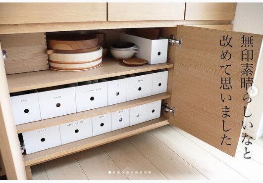 無印のポリプロピレンファイルボックスのハーフサイズを使って食器棚を整理整頓している例です。棚の幅にボックスがぴったりはまっていますね。無印良品の食器棚には無印良品の収納だと相性がよいようですね。