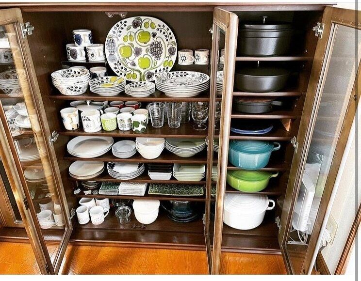 お皿の数が多くなると、どうしてもごちゃごちゃしてしまう食器棚ですが、使わない食器は思い切って処分するのも大事です。あとは、使用頻度が高いものは取り出しやすい下段に置くなど、定期的に整理整頓することが大事ですね。