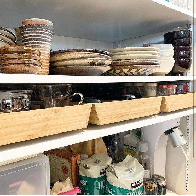 食器棚に、ただ食器を並べるのではなく、マグやこまごまとしたアイテムの下に、ニトリの「滑りにくい木製トレイ」を敷くアイデア。このアイデアだと、奥の方にしまってあるアイテムを取りだすときもトレイを引っ張ればいいだけなので、便利ですね。ただのトレイではなく、滑りにくい加工がされているものを選ぶと安心です。