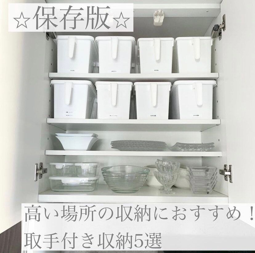 セリアのスタッキングボックスを使った、食器棚の収納アイデアです。持ち手がついているので、食器棚の上のほうでも取り出しやすく、統一感があることですっきりとした食器棚収納になりますね。