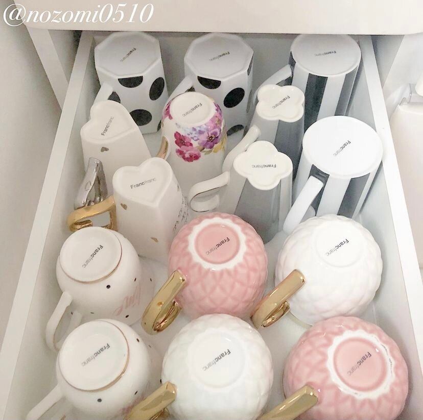 引き出しをすべてマグカップ収納にすると、マグカップのデザインが見えて、見た目もかわいく収納できます。マグカップが好きで集めているかたにも、おすすめの収納方法です。