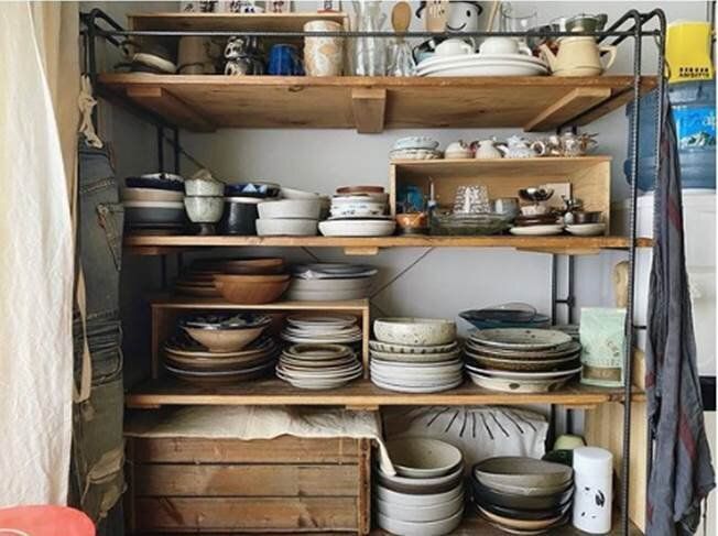 あえて見せる収納にする技もおすすめ。食器類は透明なものはまとめて置く…など、いっしょに置く色味を合わせることによって、ごちゃごちゃ感がカバーされます。扉がないため、サッと取り出しやすいのも使いやすいポイントです。上部には高さがあるものも置けるため、食器棚に入りきらない!という悩みも解決できますね。