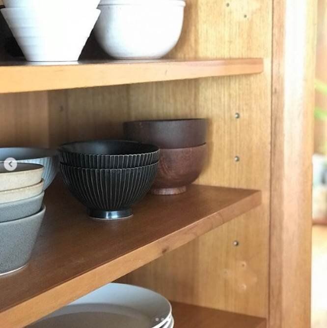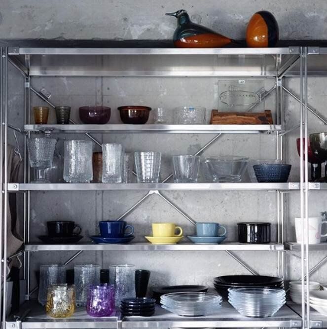 ヴィンテージから現行品まで、美しく収納された北欧食器たち。コンクリート打ちっぱなしの背景にメタリックな食器棚。そこにモダンデザインの北欧食器たちが見事に調和しています。ぎちぎちにつめこまずほどよい空間がつくりだされ、これは美しい!