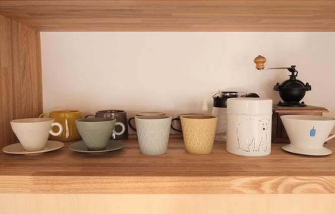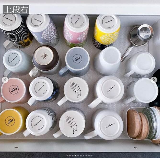 引き出しにマグカップを収納したアイデア。お気に入りのマグカップだけが並んだまるで宝箱のようなワクワクする空間ですね。マグカップの下にはすべり止めシートを敷くことで、引き出しを開けたときにガチャガチャしません。毎日のコーヒータイムが楽しみになりそう!