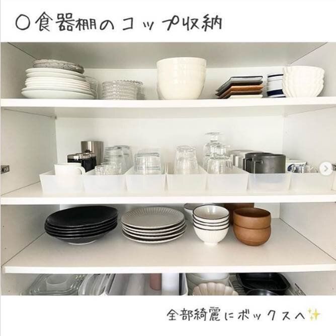美しく整えられた食器棚。グラスやマグカップが収納されている乳白色のボックスは無印良品の「ポリプロピレン整理ボックス4」です。引っぱれば奥の食器も簡単に取りだすことができるので、奥行きのある食器棚におすすめです。収納アイテムをそろえることで見た目にも美しい収納になりますね。